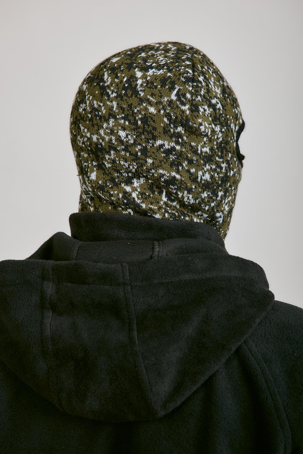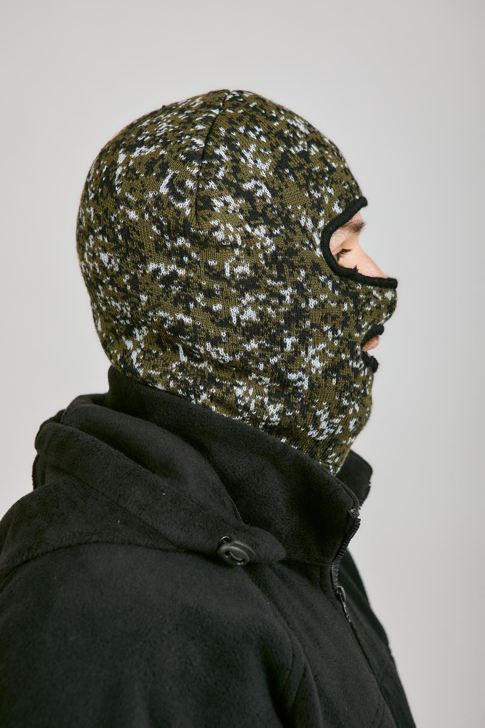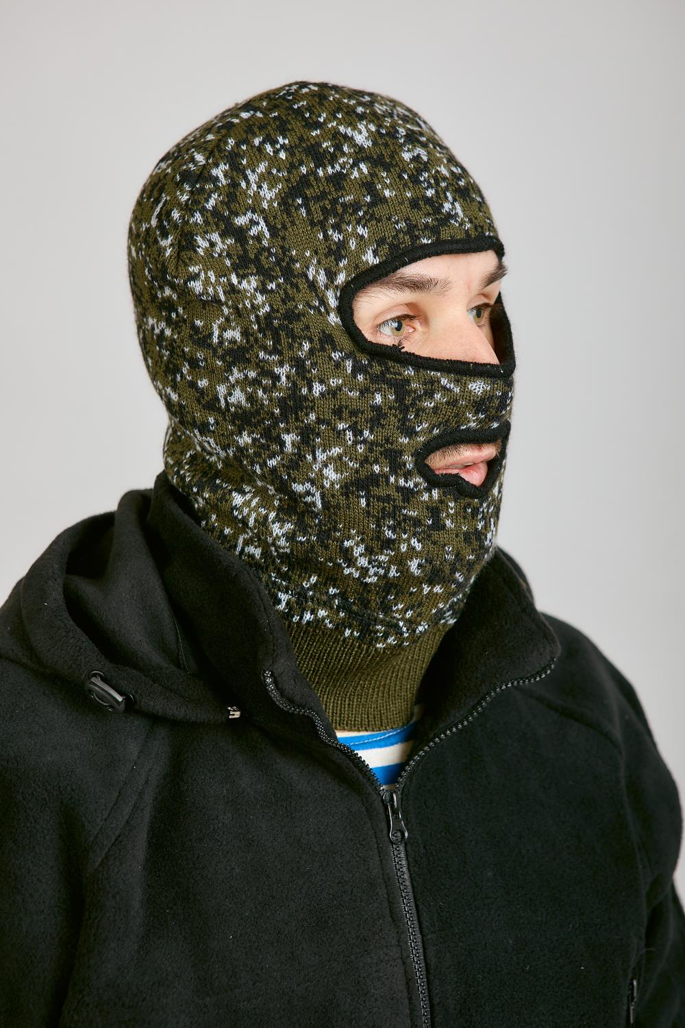 Маска полушерсть с двумя отверстиями КМФ зеленая цифра. Снаружи вязаная, внутри черный флис. Теплая.
