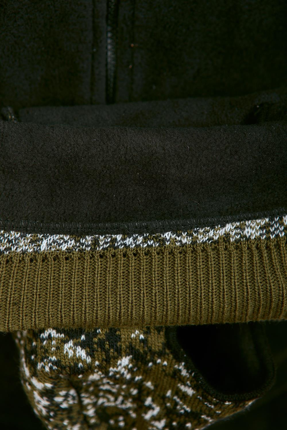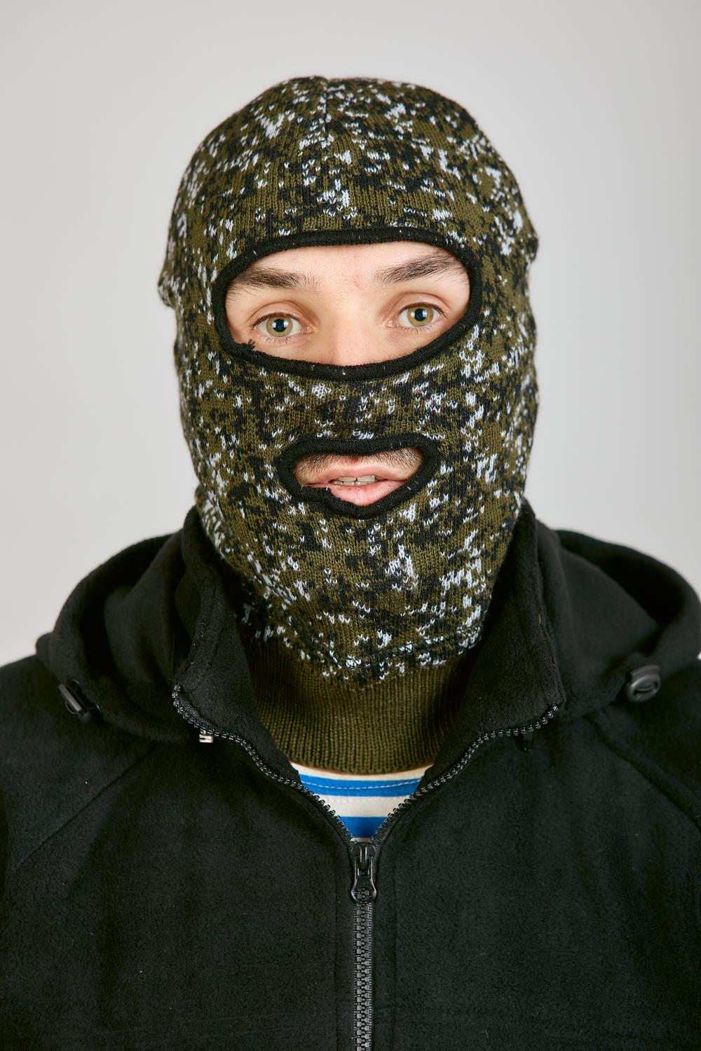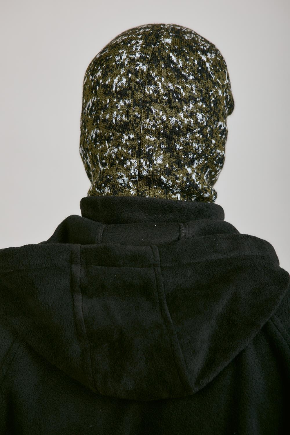 Маска полушерсть с двумя отверстиями КМФ зеленая цифра. Снаружи вязаная, внутри черный флис. Теплая.