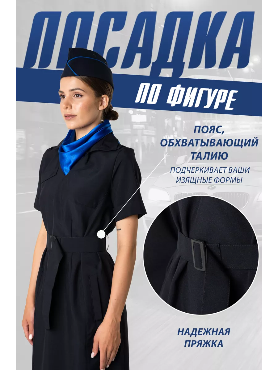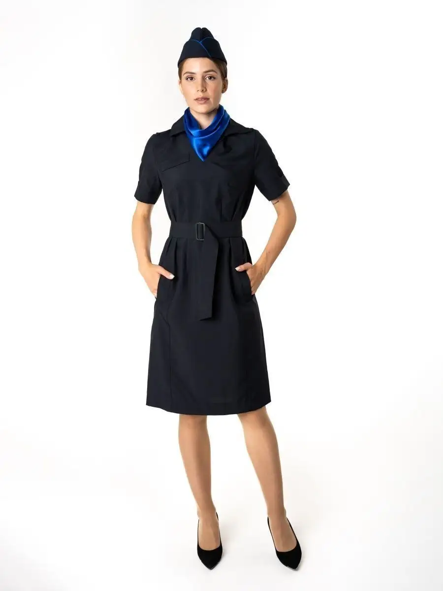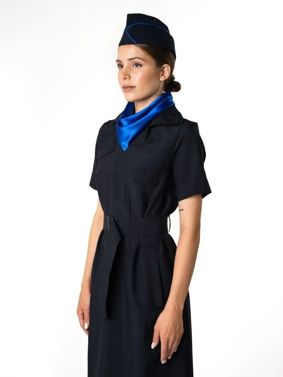 Отличается прочностью и износостойкостью. Не создает парникового эффекта -имеет высокую степень воздухопроницаемости. Не деформируется при стирках, почти не тянется. Платье полуприлегающего силуэта темно-синего цвета с V-образным вырезом. Ткань высокого качества позволит носить платье ежедневно, без потерь в эстетике и без деформации ткани. Спинка со швом посередине, заканчивающимся шлицей и талиевыми вытачками. Для крепления съемных погон в области плечевых швов- две шлевки и одна обметанная петля. Воротник отложной со стойкой. Пояс съемный, застегивающийся на пластиковую пряжку. В боковых швах-шлевки для пояса.