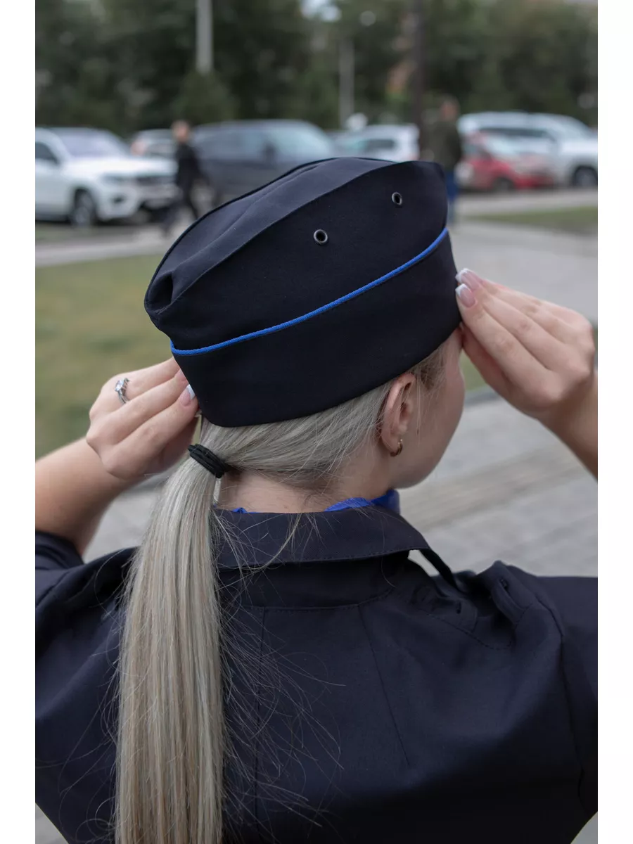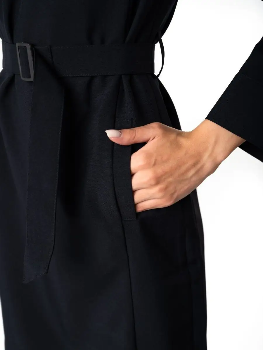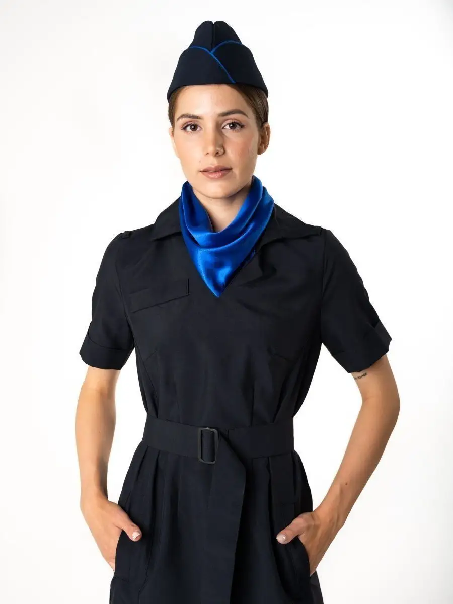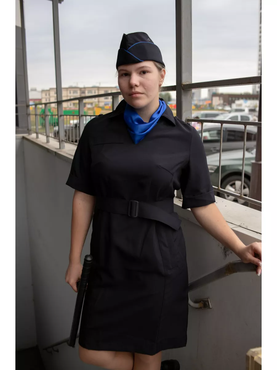 Отличается прочностью и износостойкостью. Не создает парникового эффекта -имеет высокую степень воздухопроницаемости. Не деформируется при стирках, почти не тянется. Платье полуприлегающего силуэта темно-синего цвета с V-образным вырезом. Ткань высокого качества позволит носить платье ежедневно, без потерь в эстетике и без деформации ткани. Спинка со швом посередине, заканчивающимся шлицей и талиевыми вытачками. Для крепления съемных погон в области плечевых швов- две шлевки и одна обметанная петля. Воротник отложной со стойкой. Пояс съемный, застегивающийся на пластиковую пряжку. В боковых швах-шлевки для пояса.