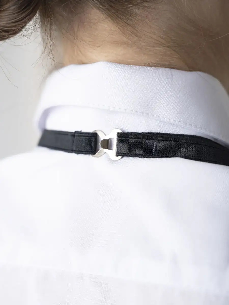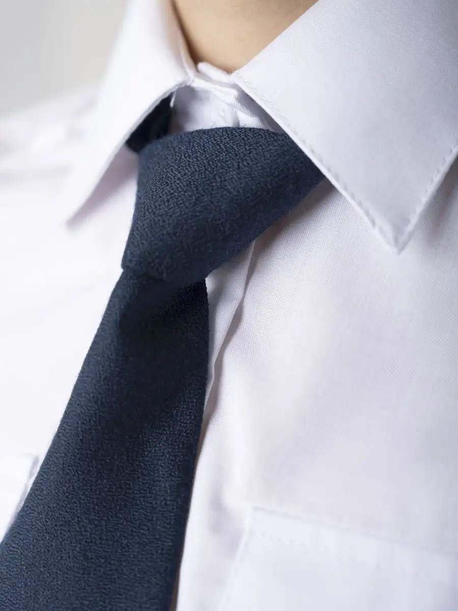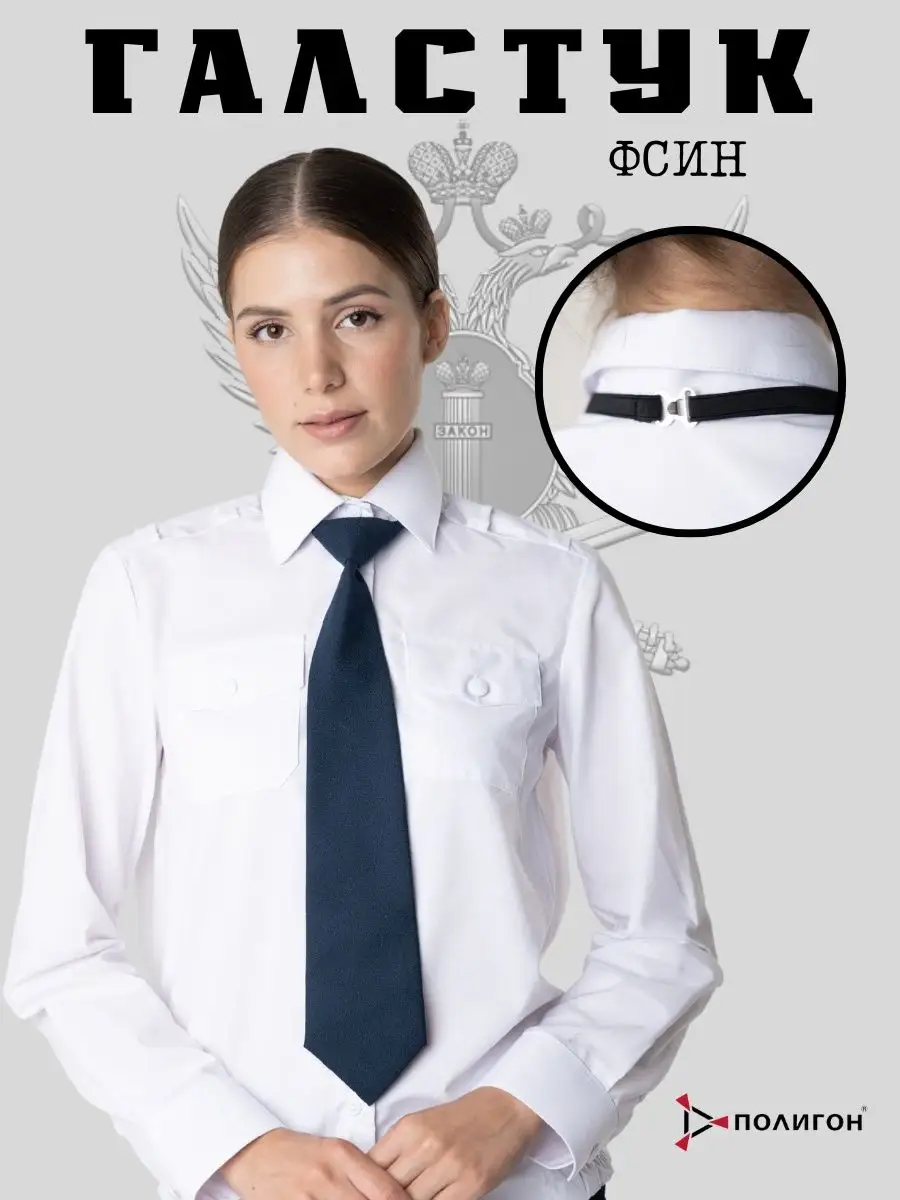 Галстук-регат форменный серо-синий ФСИН состоит из основной детали, узла и шейки. Широкий конец основной детали заканчивается углом, боковые стороны наклонные. Шейка галстука состоит из основной ткани, тесьмы эластичной и металлической фурнитуры. Длина галстука 40 см до узелка и узелок 5 см.