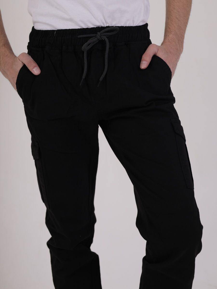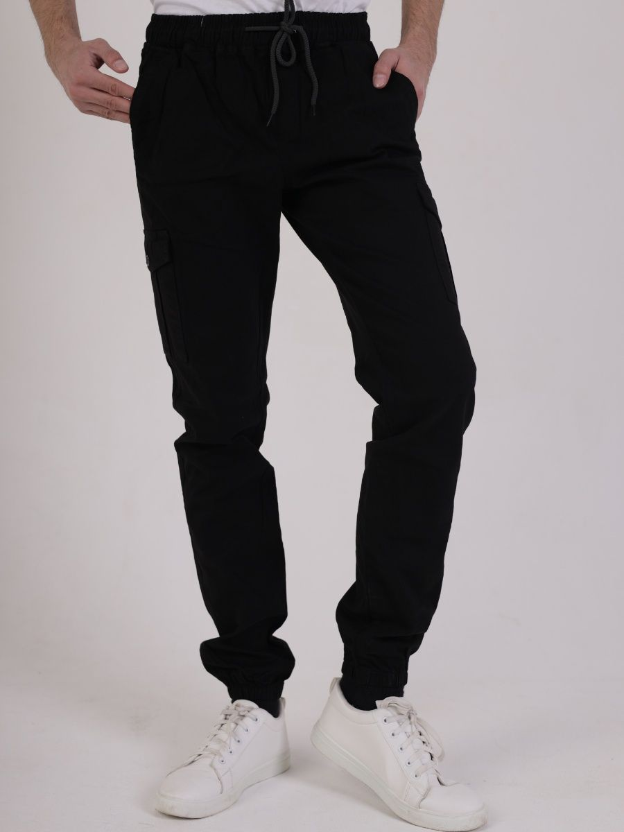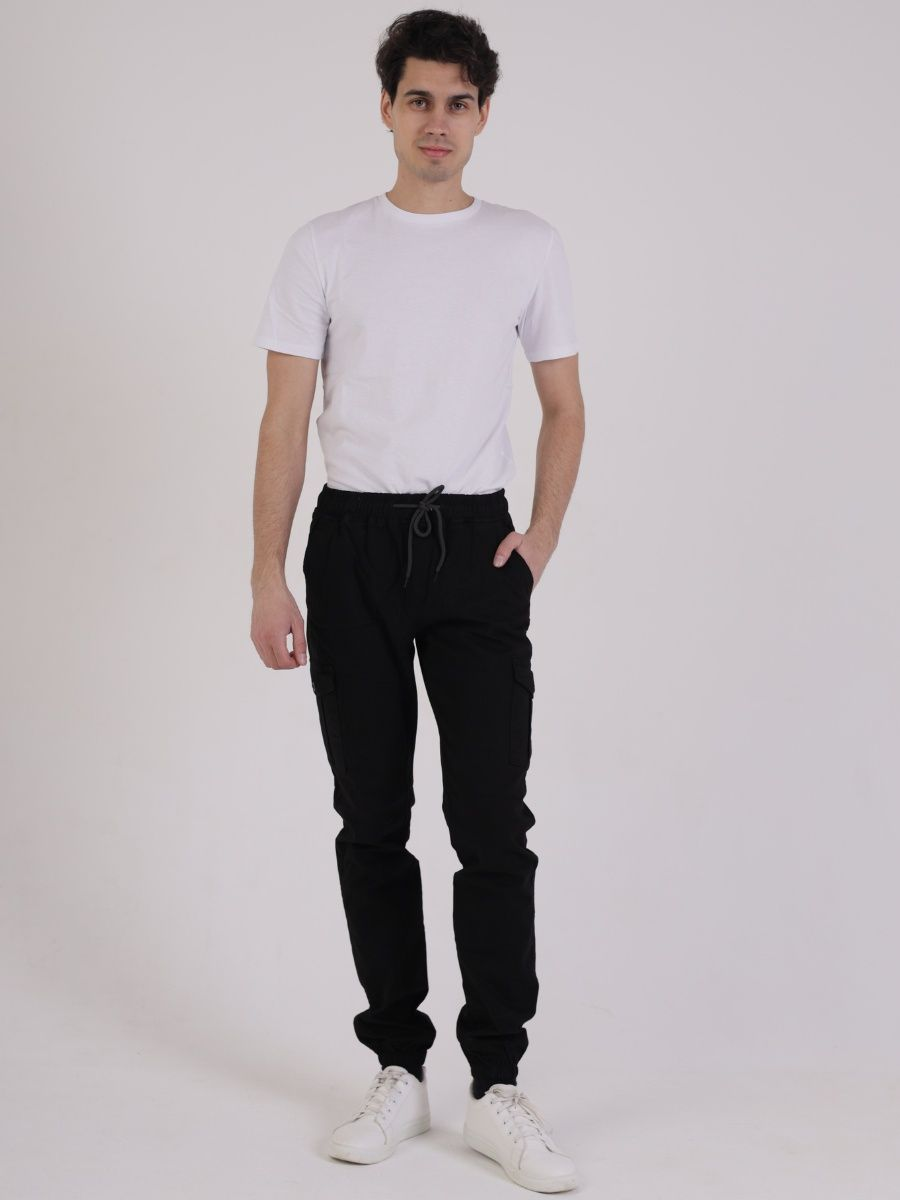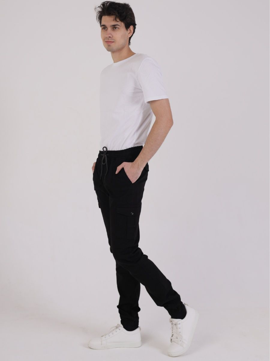Брюки мужские представлены в черном цвете. Джоггеры удачная модель объединившая спортивный стиль с городским. Штаны стильно смотрятся и хорошо сочетаются с футболками, куртками, рубашками. Отлично вписываются у каждого мужчины, женщины, подростка в гардеробе. Материал джоггеров состоит из 97% хлопка, 3% полиэстер. Для различных аксессуаров предусмотрено 6 карманов: 2 прорезных, 2 накладных на бедрах, 2 накладных задних кармана. Все карманы глубокие и функциональные и ими удобно пользоваться. Отличительная черта этих спортивных штанов является резинка на талии, а также манжеты на щиколотках в виде резинки. Благодаря резинкам при необходимости брюки можно легко поднять. Брюки удобно носить с высокими берцами, кроссовками, мокасинами. Коллекцию карго джогерров весна-лето можно увидеть не только на стадионах и в спорт залах, но и на улицах и даже в офисах.