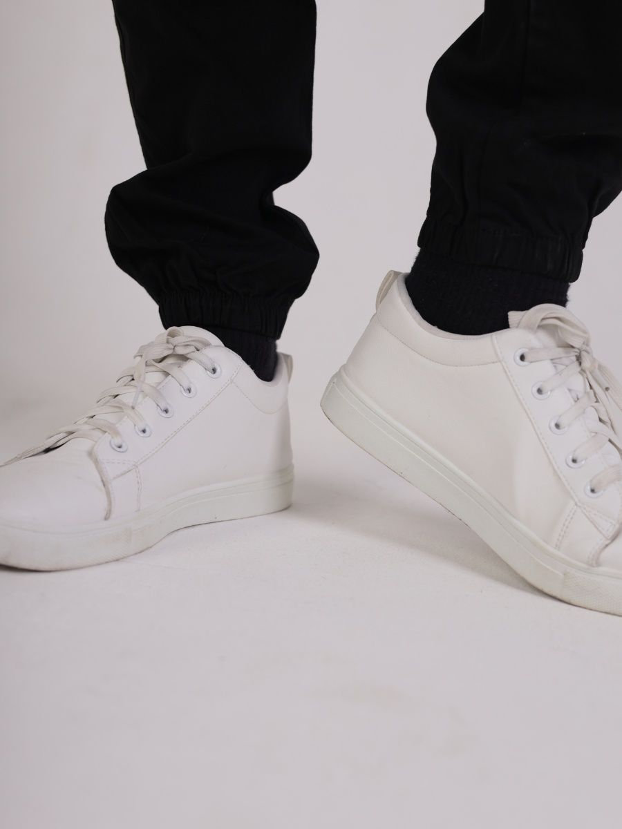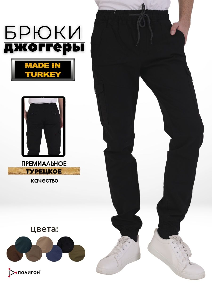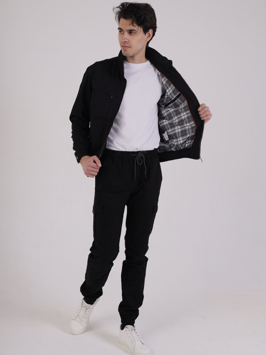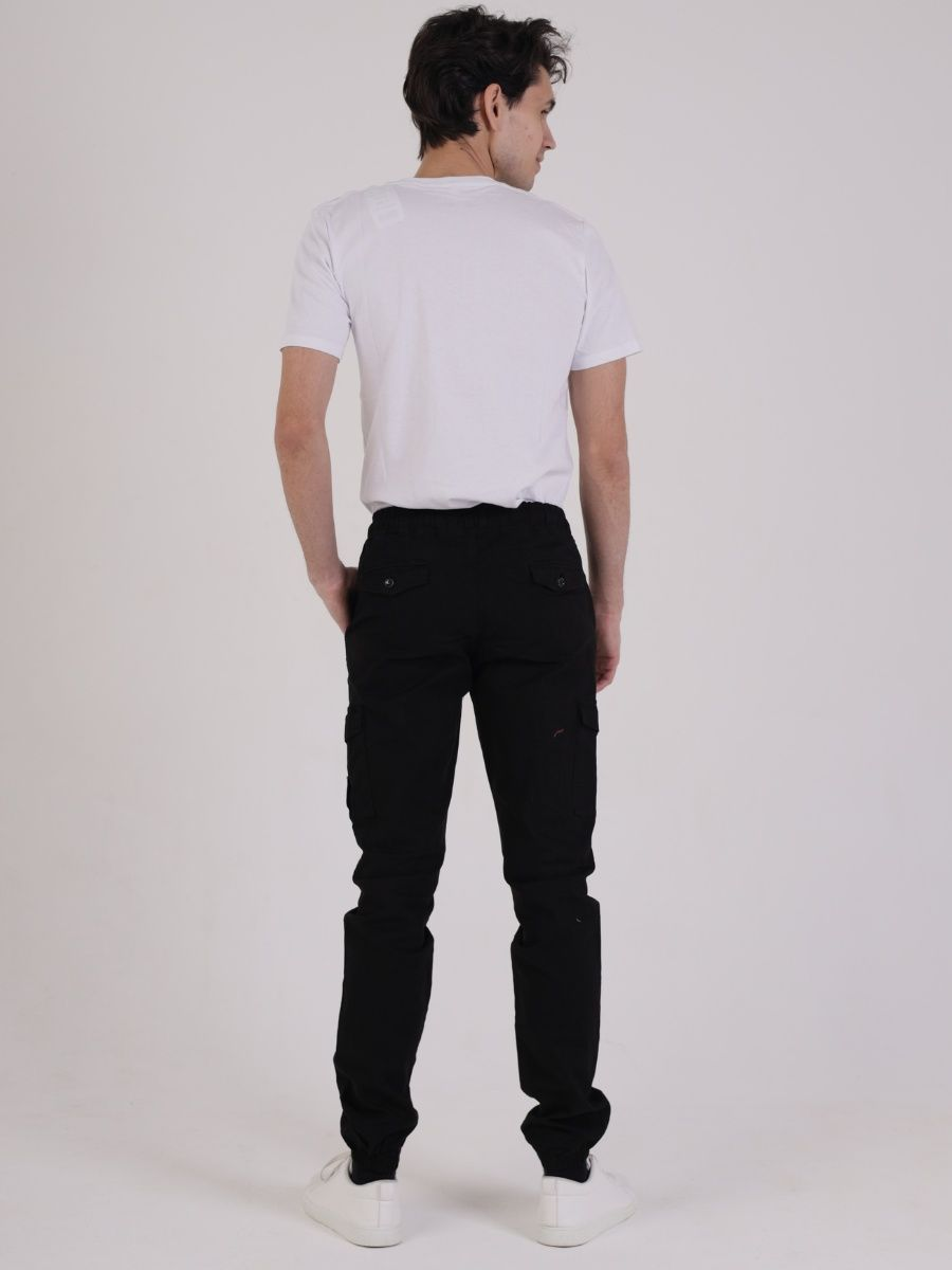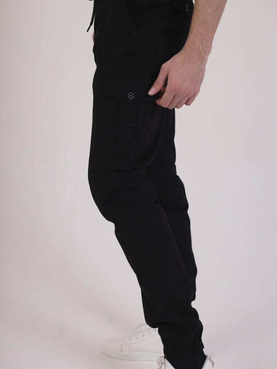 Брюки мужские представлены в черном цвете. Джоггеры удачная модель объединившая спортивный стиль с городским. Штаны стильно смотрятся и хорошо сочетаются с футболками, куртками, рубашками. Отлично вписываются у каждого мужчины, женщины, подростка в гардеробе. Материал джоггеров состоит из 97% хлопка, 3% полиэстер. Для различных аксессуаров предусмотрено 6 карманов: 2 прорезных, 2 накладных на бедрах, 2 накладных задних кармана. Все карманы глубокие и функциональные и ими удобно пользоваться. Отличительная черта этих спортивных штанов является резинка на талии, а также манжеты на щиколотках в виде резинки. Благодаря резинкам при необходимости брюки можно легко поднять. Брюки удобно носить с высокими берцами, кроссовками, мокасинами. Коллекцию карго джогерров весна-лето можно увидеть не только на стадионах и в спорт залах, но и на улицах и даже в офисах.