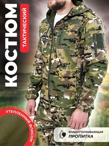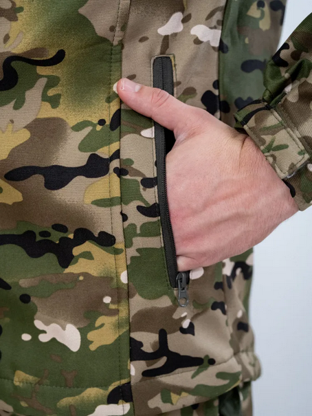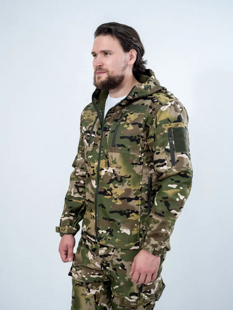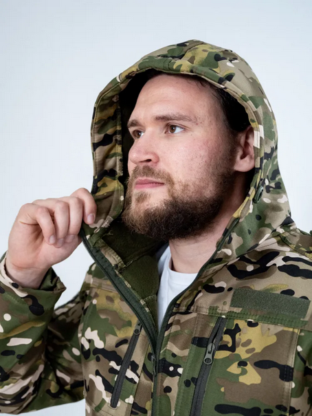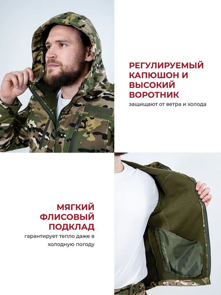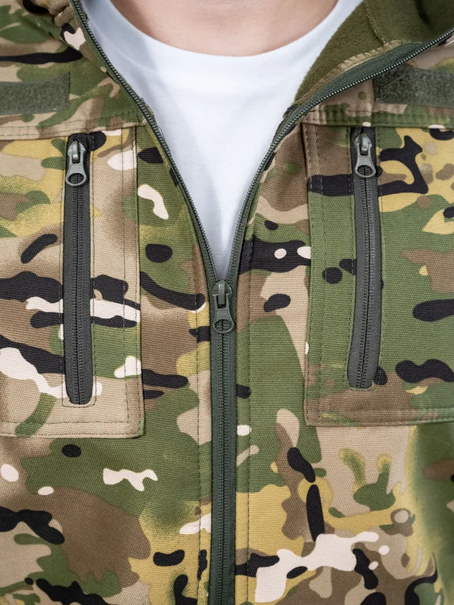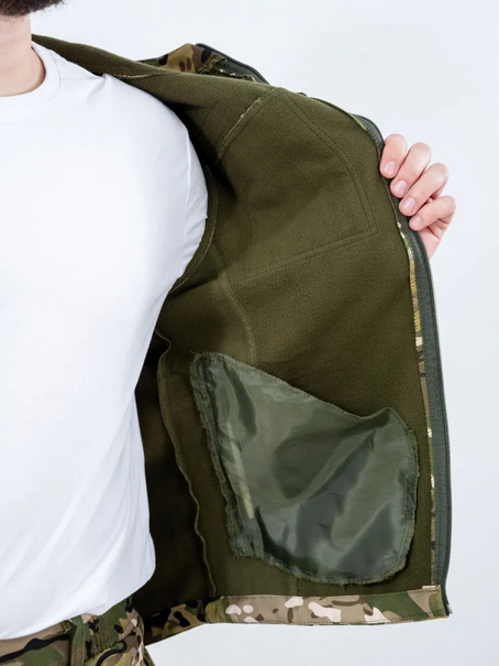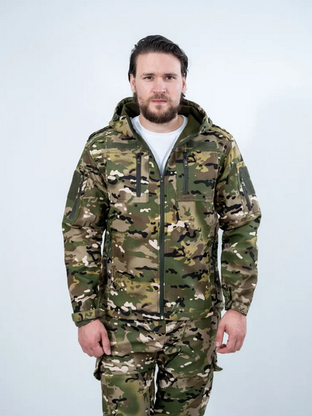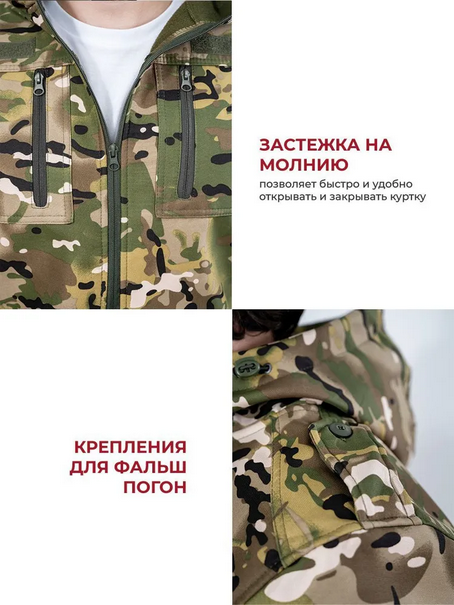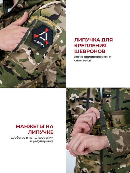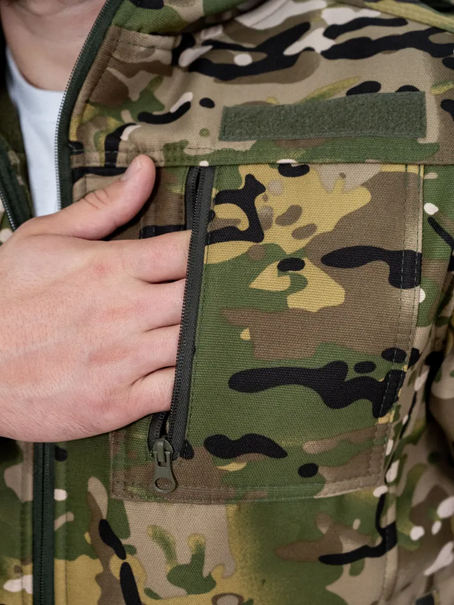 Куртка имеет 2 верхних кармана, 2 боковых кармана, два кармана на рукавах, липучки под шеврон