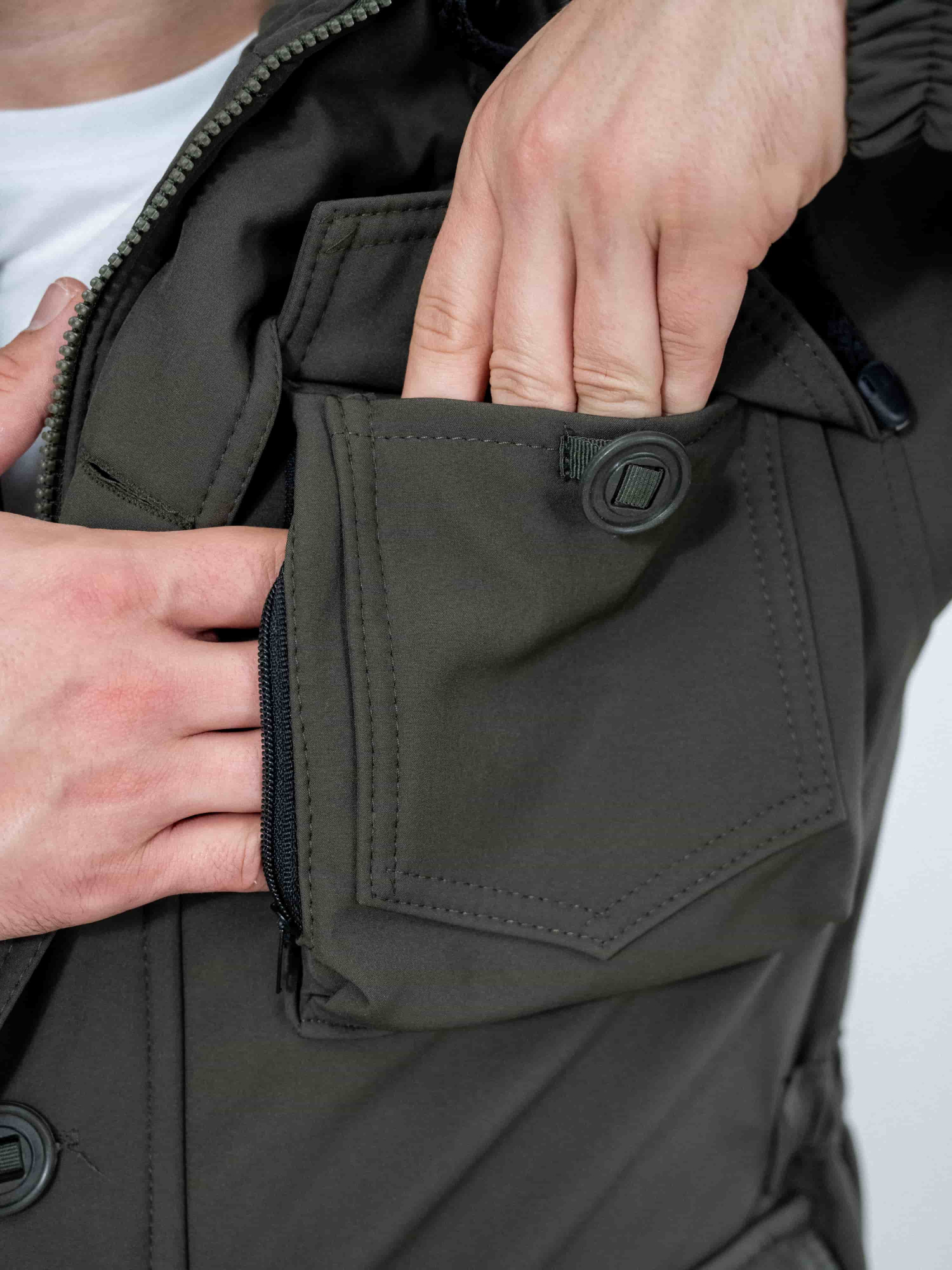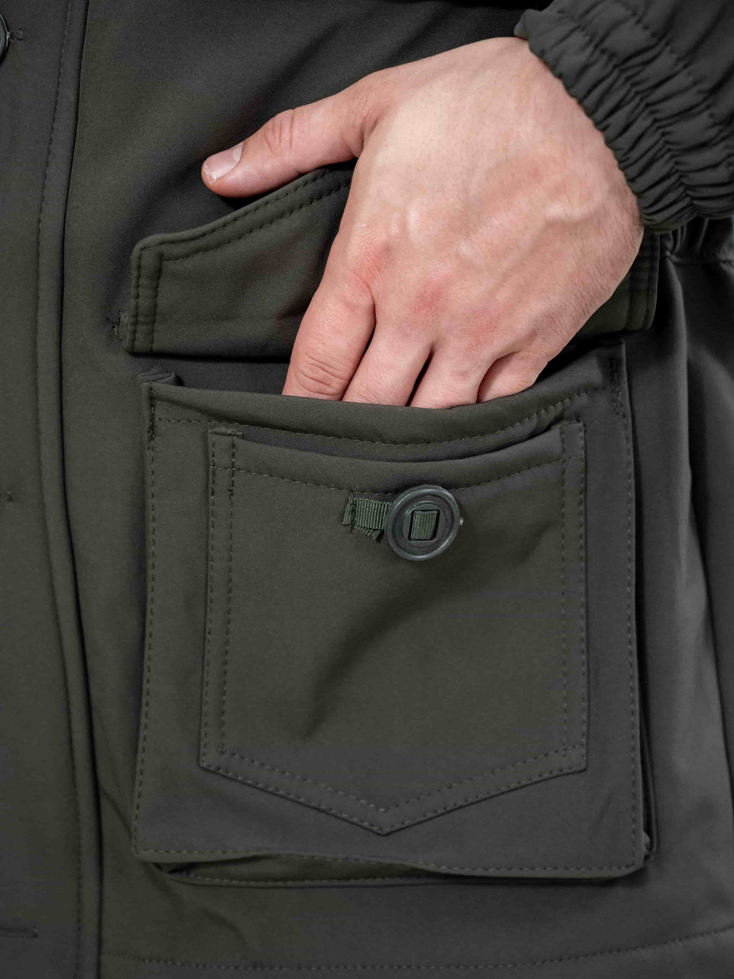 Куртка имеет 4 кармана на пуговицах,  два кармана на рукавах, липучки под шеврон.