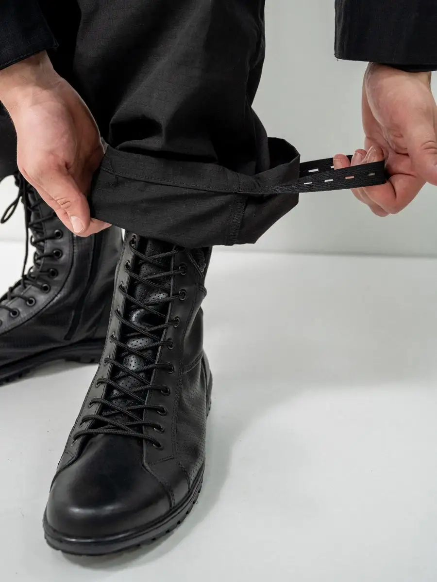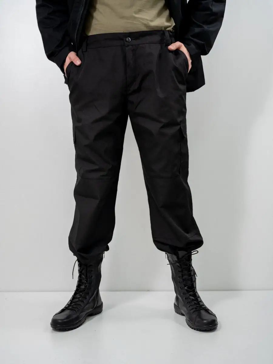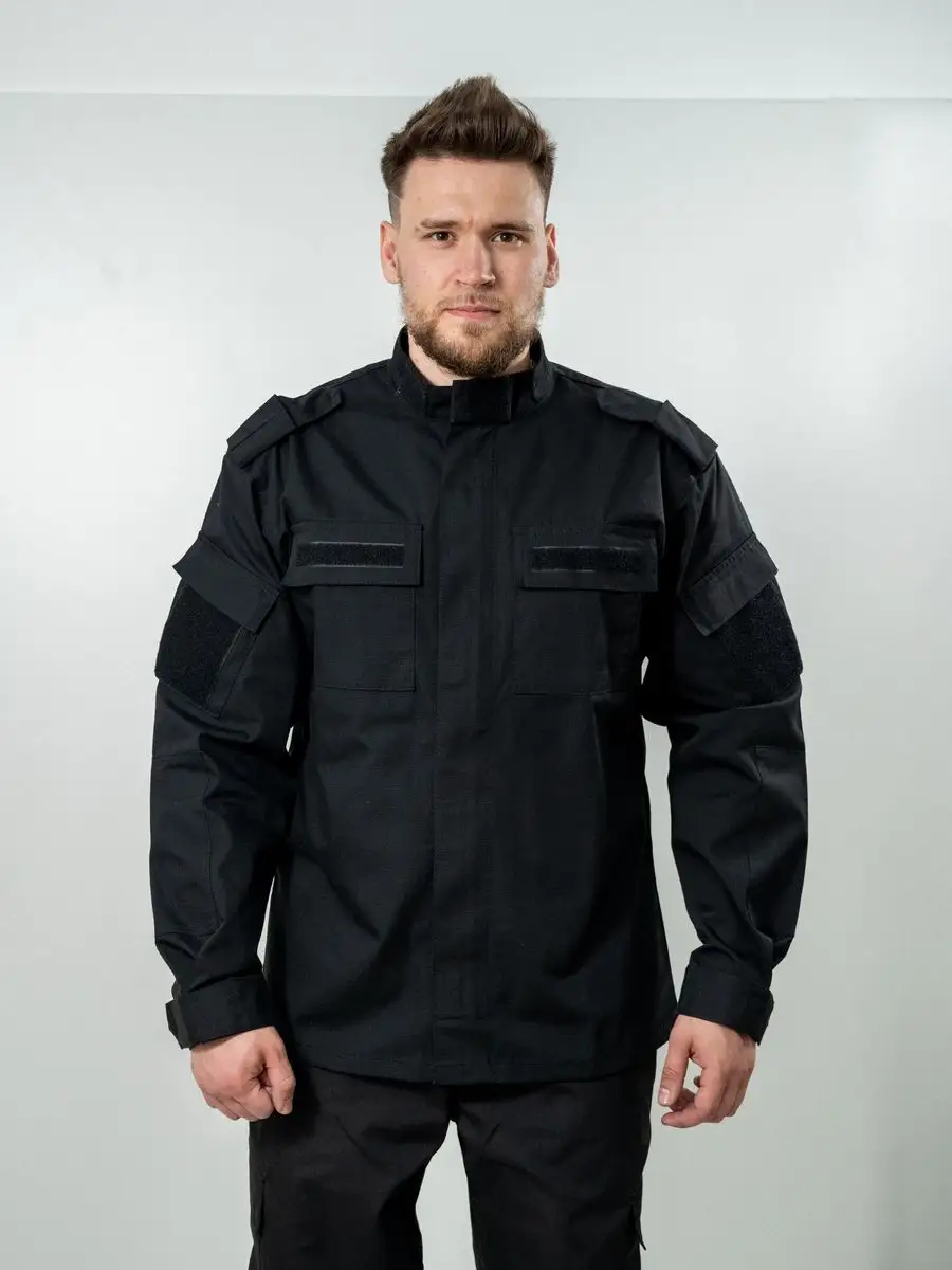 Упрощенный полевой летний костюм ВКБО ткань рип-стоп черный. Швы с дополнительной отстрочкой для надежности, закрепки-зигзаги в нагруженных местах. Простые усиления локтей. Центральная застежка на тракторную пластиковую двухзамковую молнию. На плечах наклонные карманы с клапанами, большая липучка для крепления шевронов . Липучки под именные ленты на груди, манжеты с патами на липучках, на плечах пришиты погоны с застежкой на липучку, в комплекте фальшпогоны. Пояс брюк застегивается на пуговицу, низ брюк стягивается вшитой тонкой тесьмой. Область сиденья усилена накладкой. На брюках глубокие боковые врезные карманы, большие накладные грузовые карманы, задний карман. Легкая смесовая быстросохнущая ткань. Костюм для холодной погоды. За счет характеристик ткани: отталкивает воду, защищает от непогоды, ветра. Быстро сохнет, отличный воздухообмен, высокая паропроницаемость при нагрузках. Легкий и компактный, эластичный. Эргономичный крой позволяет регулировать посадку по фигуре.