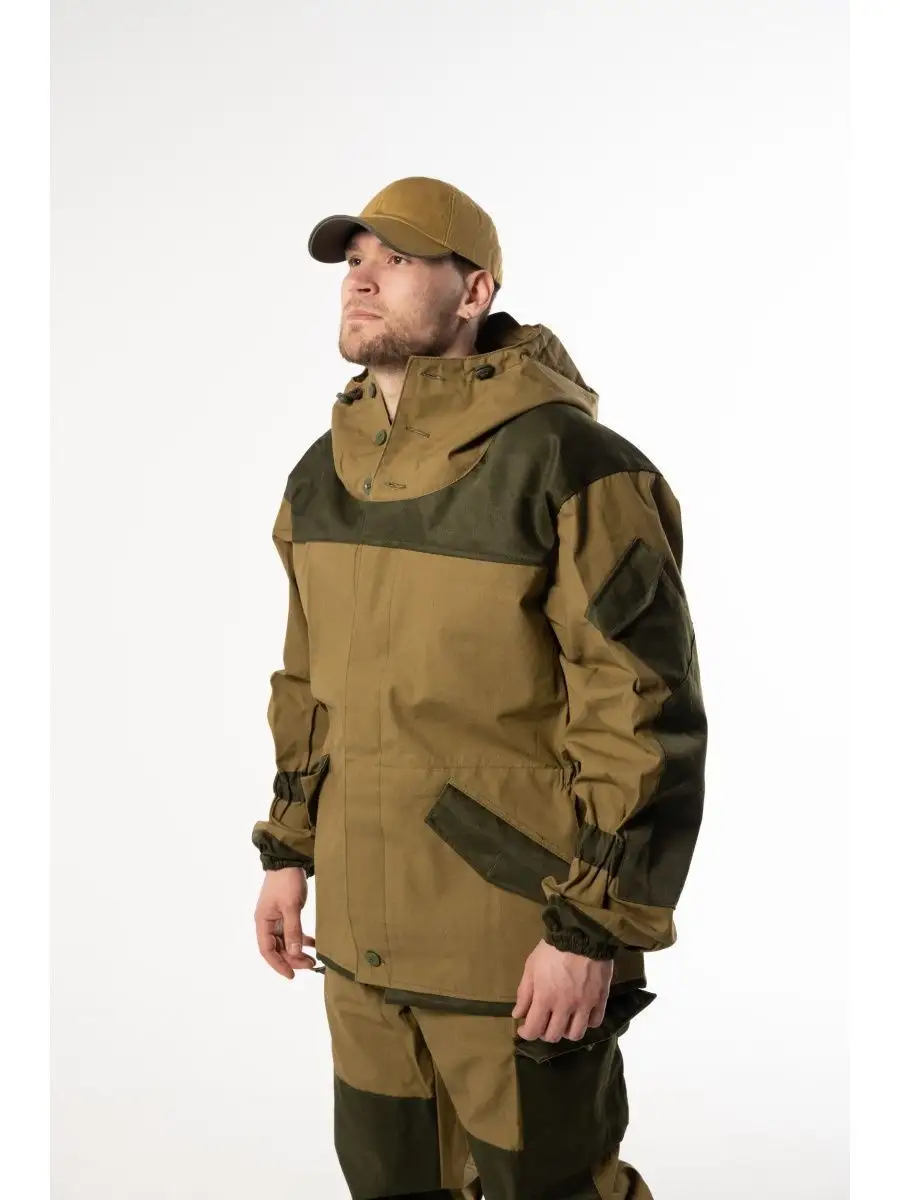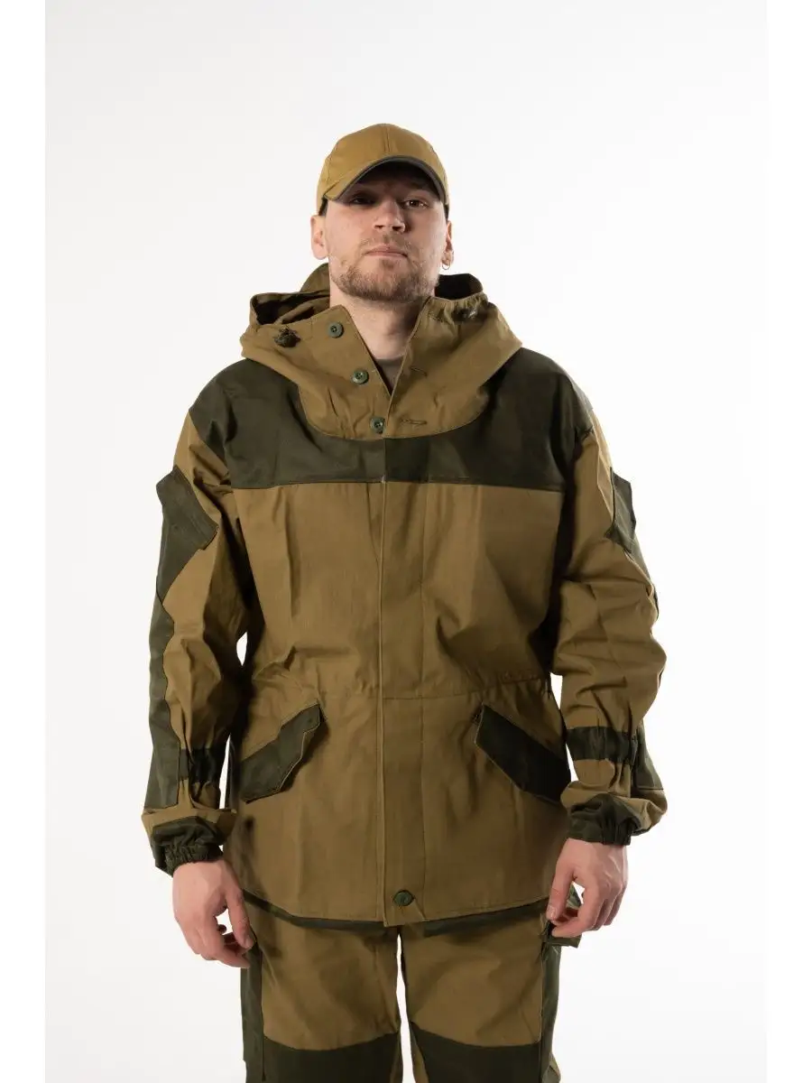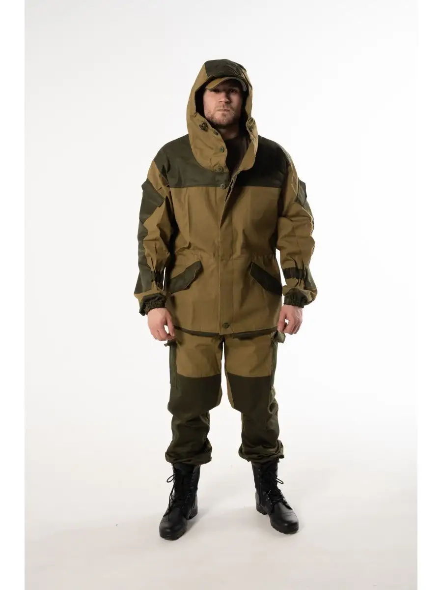 Штормовой горный костюм Горка 3. Костюм камуфляжный маскировочный можно носить в демисезон (ткань костюма плотная). Популярен среди военнослужащих, охотников, рыбаков и туристов. Костюм тактический состоит: куртка, брюки, подтяжки. Материал палаточное полотно, 100% хлопок. Куртка свободного кроя. Застёжка центральная на петлю и пуговицу. Кокетка, накладки и карманы из отделочной ткани. 2 нижних прорезных кармана с клапаном, на петлю и пуговицу. На рукавах по 1 накладному наклонному карману с клапаном на петлю и пуговицу. В области локтя усиливающие фигурные накладки, низ рукавов на резинке. Капюшон двойной, с козырьком, имеет утягивающую кулису для регулировки по объему, подгонка по талии с помощью кулиски. Брюки свободного покроя, в области коленей, на задних половинках брюк в области сидения усиливающие накладки, 2 боковых накладных кармана с клапаном. Крой деталей в области коленей препятствует их вытягиванию.