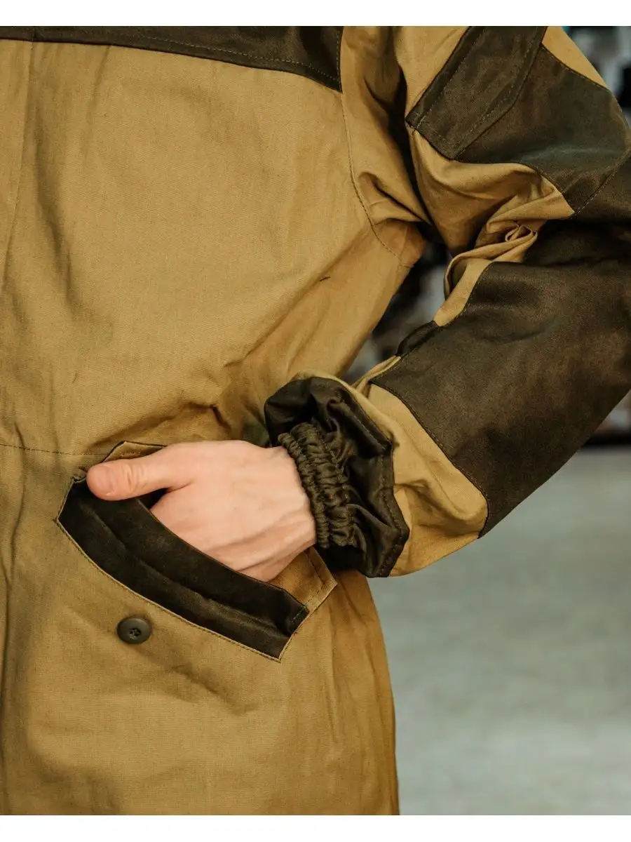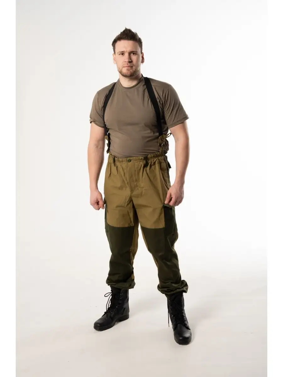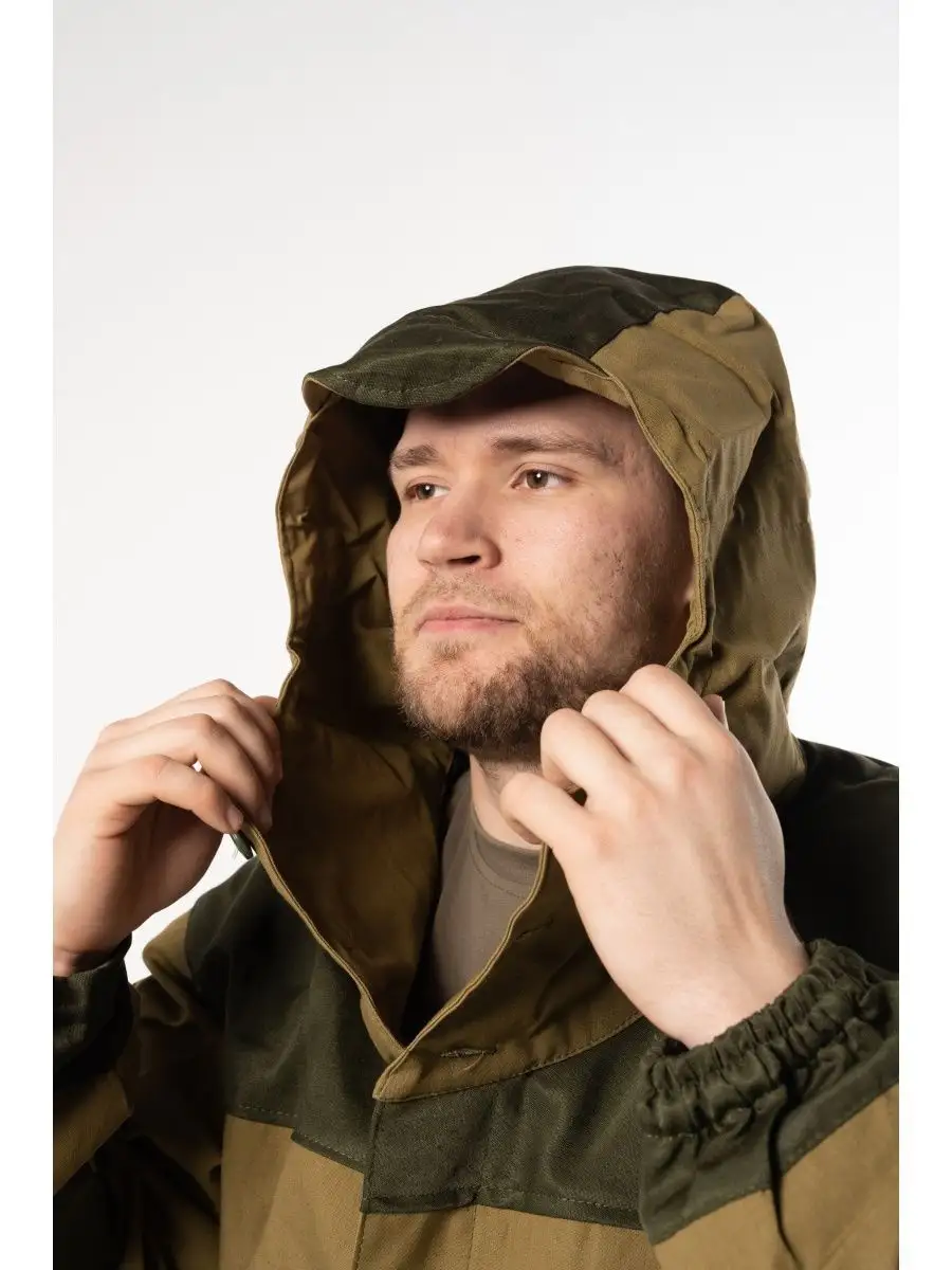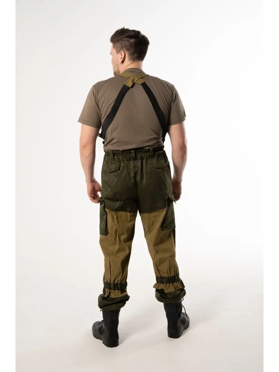 Штормовой горный костюм Горка 3. Костюм камуфляжный маскировочный можно носить в демисезон (ткань костюма плотная). Популярен среди военнослужащих, охотников, рыбаков и туристов. Костюм тактический состоит: куртка, брюки, подтяжки. Материал палаточное полотно, 100% хлопок. Куртка свободного кроя. Застёжка центральная на петлю и пуговицу. Кокетка, накладки и карманы из отделочной ткани. 2 нижних прорезных кармана с клапаном, на петлю и пуговицу. На рукавах по 1 накладному наклонному карману с клапаном на петлю и пуговицу. В области локтя усиливающие фигурные накладки, низ рукавов на резинке. Капюшон двойной, с козырьком, имеет утягивающую кулису для регулировки по объему, подгонка по талии с помощью кулиски. Брюки свободного покроя, в области коленей, на задних половинках брюк в области сидения усиливающие накладки, 2 боковых накладных кармана с клапаном. Крой деталей в области коленей препятствует их вытягиванию.